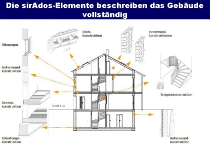 Während des Entwurfsprozesses arbeitet der Planer in seiner gewohnten Entwurfsumgebung mit Bauelementen (z.B. 1 m² Außenwand), die aus detaillierten Leistungspositionen bestehen und mit Kostendaten, bauphysikalischen Daten und Energie- und Stoffflußkoeffizienten hinterlegt sind. Diese Elemente sind mit ihren relevanten Daten Teil eines unabhängigen Bauteilkataloges (sirAdos-Baukatalog).
