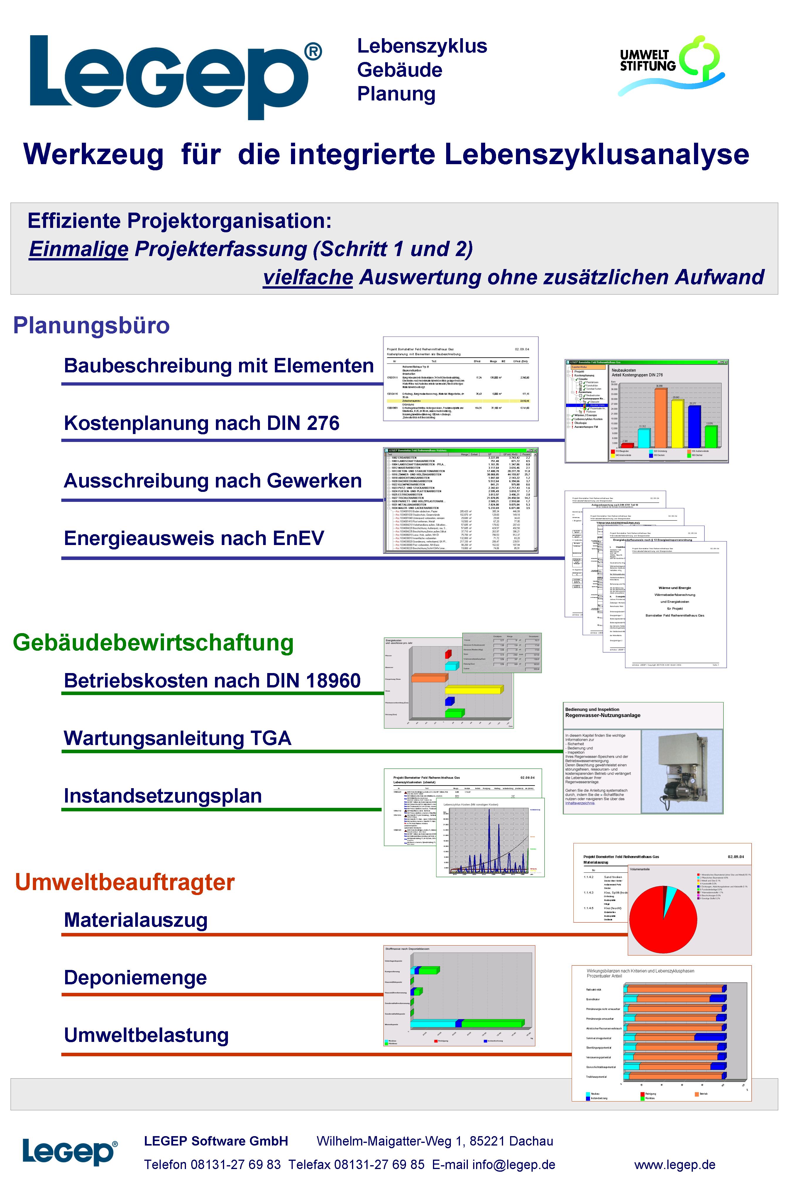 LEGEP ist ein Werkzeug für die integrale Lebenszyklusanalyse. Es unterstützt das Entwerfen, Berechnen und Bewerten von beliebigen Bauobjekten. Es umfasst die Mengenermittlung (Bauteilkatalog), die Baukostenberechnung (DIN 276 Erstellungskosten), die Lebenszykluskostenberechnung (Herstellungs- und Nutzungskosten nach DIN 276, DIN 18960 und Final Report EU-TG4 LCC in Construction) differenziert nach Phasen (Reinigung, Wartung, Instandsetzung, Rückbau), den direkten Energiebedarf (Heizung, Warmwasser, Elektrizität) und die Betriebskosten, die Erstellung des Energiebedarfsausweises (EnEV 2001 und EN 832) und die Umweltbilanzierung (Stoffflüsse und effektorientierte Bewertung basierend auf ISO 14040-43).
