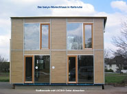 Das basys-Haus von der BAU 2005 wurde als erstes regionales Musterhaus in Karlsruhe aufgebaut und hat seit 1.April 2005 mit den LUCIDO-Absorber-Elementen und den SCHÖB-Fensterelementen ein neues Gesicht. In den nächsten Wochen werden die Dämmfassaden ergänzt und der Innenausbau ausgeführt. Wir konnten bereits eine Reihe von weiteren Sponsoren in dieses Konzept einbinden, womit für das basysHaus die umfassende Gebäudedokumentation und Umweltbilanzierung sichergestellt wird.