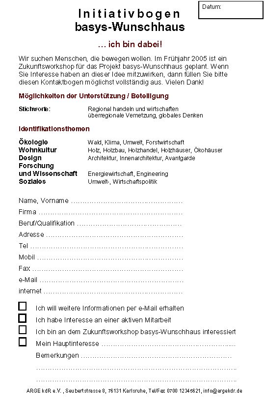 Wir suchen Menschen, die bewegen wollen. Im Frühjahr 2005 ist ein Zukunftsworkshop für das Projekt basys-Wunschhaus geplant. Wenn Sie Interesse haben an dieser Idee mitzuwirken, dann füllen Sie bitte diesen Kontaktbogen aus. Vielen Dank!