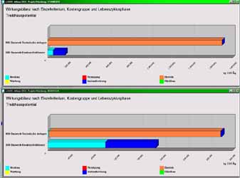 Wirkungsbilanz nach Kriterien und Phase Materialanteile Volumenanteile Versauerungspotential Wirkungsbilanz, Treibhauspotential